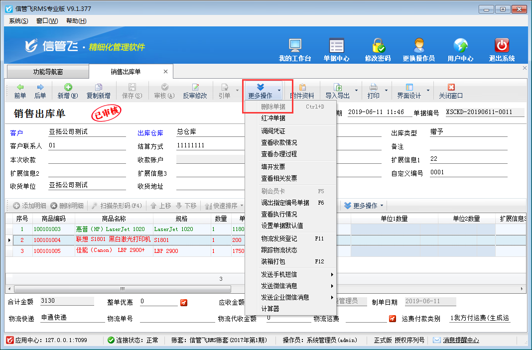 信管飞RMS(进销存管理软件)、信管飞仓库管理软件中业务单据已审核后默认是不允许删除的,如下图所示,删除按钮为灰色的,不可操作,那么如果单据审核后发现此单做错了,需要删除,如何操作呢?本篇文章详细介绍一下仓库管理软件内如何删除已审核的业务单据?