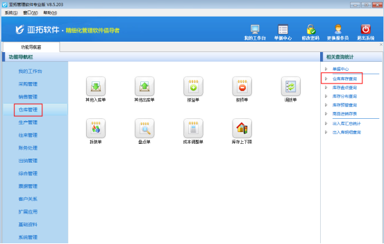 亚拓管理软件专业版、标准版、星光版和红管家仓库管理软件支持库存管理功能,为了更直观的发现库存数量,软件中可以对商品库存数量进行库存上下限设置,并可以在仓库管理模块中的“相关查询统计”中进行库存预警查询。