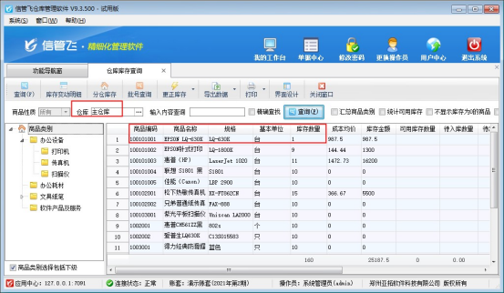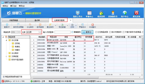 本文以“信管飞仓库管理软件”为例,示范下如何开“盘点单”,在功能导航窗点击“仓库管理”—>“仓库库存查询”,可查看商品的当前库存数量,以示例商品“EPSON LQ-630K”的库存数量为例,当前查询到库存数数量为1。存在多仓库情况的,需要先选择仓库然后再进行查询,是获取查询的仓库中的库存数量,如下图所示: