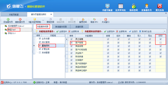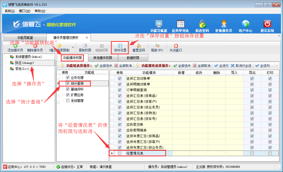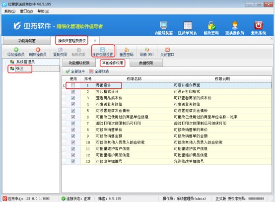 登录软件,在功能导航窗点击“系统管理”—》“操作员及授权”,进入“操作员管理及授权”界面,选择操作员“张亚”,在其右侧的功能模块权限内选择“统计查询”模块,将送货明细对账单的“导出”权限勾选取消,然后保存设置,如下图所示: