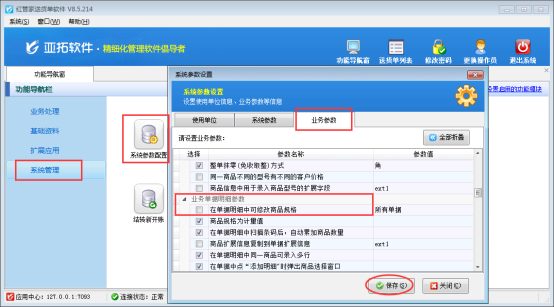 在功能导航窗点击“系统管理”—》“系统参数配置”,把“业务参数”中的“退货单在选择价格窗口显示最近送货单”参数启用保存,如下图所示: