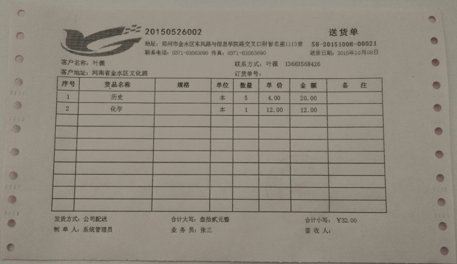 送货单抬头的地址、联系方式等信息也可以修改,修改方法类似,在此不再赘述。