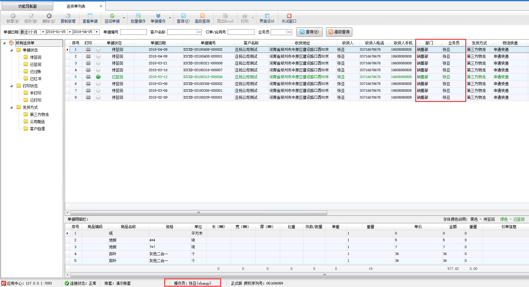 权限保存完成后,使用操作员“张亚”登录软件,打开送货单列表,可以查询到只有制单人为“张亚”的单据,其他人所开单据不显示,如下图所示: