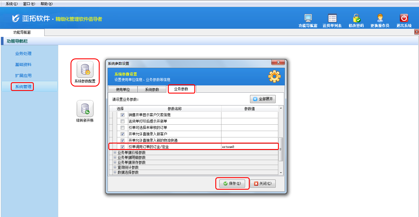 在功能导航窗点击“系统管理”—》“系统参数配置”—》“系统参数”,在“系统参数”界面可以设置“普通发票税率”及“增值税发票税率”(这里分别设置为3%及13%),设置完之后点击“保存”按钮保存配置,如下图所示: