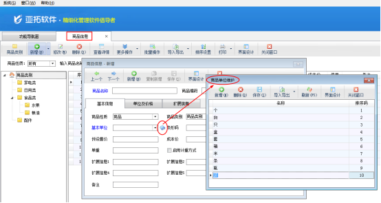 在新增商品窗口,如图2所示,点击“基本单位”后面的书本标志图标按钮,系统弹出“商品单位维护”窗口,可以进行新增、删除、导入、导出商品单位信息等操作,最后点击“保存”按钮进行保存即可。
