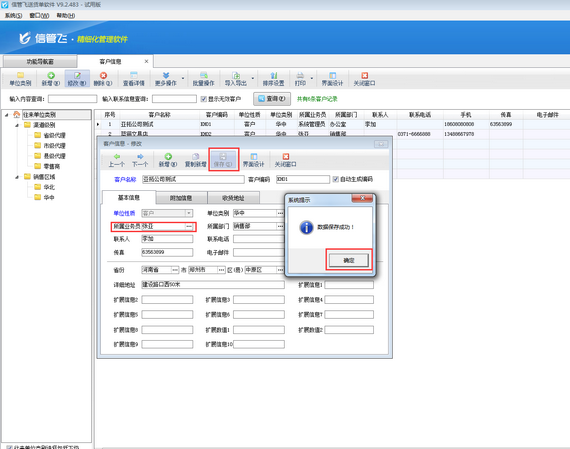选择员工后,修改客户信息界面所属业务员已修改为“张亚”,点击保存,即弹出提示框“数据保存成功!”,保存键变为灰色。如下图所示: