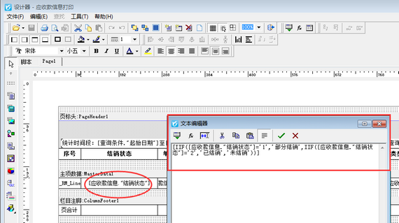 在应收款管理界面点击“打印”—》“打印格式设计”—》“设计格式”打开模板设计器,将结销状态调用内容更换为函数:[IIF([应收款信息."结销状态"]='1','部分结销',IIF([应收款信息."结销状态"]='2','已结销','未结销'))],如下图所示。