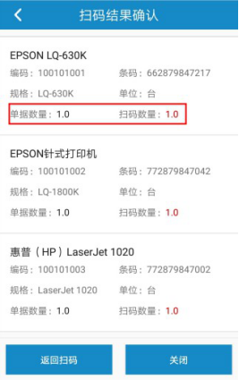 点击扫码完成会弹出扫码确认界面,可确认开单数量和扫码数量是否一致