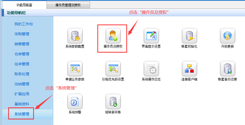 在功能导航窗点击“系统管理”—》“操作员及授权”,进入“操作员管理及授权”界面,选择操作员“张亚”,在其右侧的功能模块权限内选择“扩展应用”模块,将出入库扫码的“使用”权限勾选取消,然后保存设置,如下图所示。