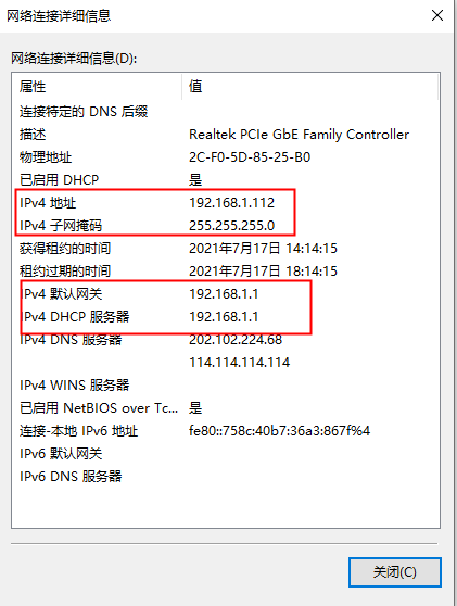 ②以太网状态如图所示,点击“详细信息”按钮,会出现如图所示的网络连接详细信息,此时需要记一下“IPv4地址”、“IPv4子网掩码”、“IPv4默认网关”和“IPv4 DNS服务器”的信息,后面固定IP地址时需要用到。