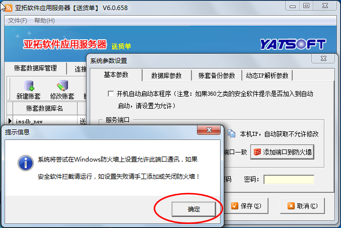 主机没问题后,客户端电脑有时可能无法连接主机,登录失败,此时请固定主机IP地址,另:打开亚拓软件应用服务器,点“文件”——》“系统参数设置”——》“基本参数”——》“添加端口到防火墙”。(为什么需固定主机IP地址及如何固定IP地址请参见这篇文章:网络版软件固定主机IP地址的方法)