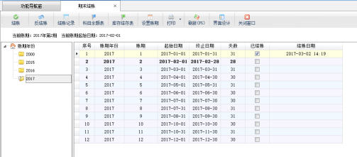 设置账期:点击工具栏的“设置账期”按钮,在弹出的业务账期设置窗口可以设置每个账期的起始日期。每年共12个账期,默认是按照自然月划分账期。修改“结账日期”后,下一个账期的起始日期会自动变化。每个账期的天数是自动计算的,不需要录入。