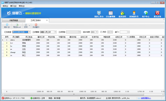 在功能导航窗点击“综合管理”—》“工资汇总统计”即可进入工资汇总统计表界面,如下图所示。