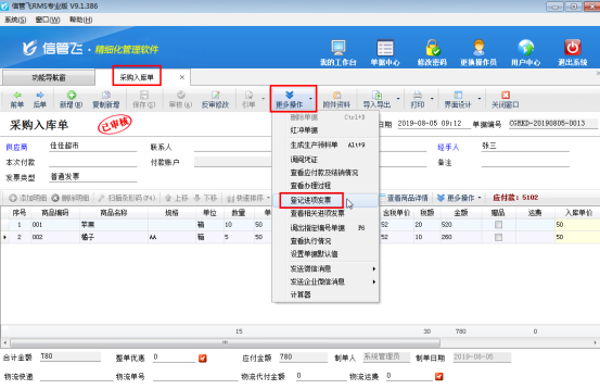 发票管理为扩展模块,只有信管飞RMS标准版和专业版支持附加使用。填开发票除了在发票管理中直接进行新增,软件也支持在开单界面直接填开发票操作。本文以信管飞RMS专业版的采购入库单为例,讲一下在采购入库单中如何快速填开发票操作。
