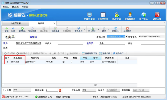 信管飞送货单软件、信管飞仓库管理软件、信管飞RMS(进销存软件)开单时,当商品存在打折情况时,支持录入商品的折扣率。当商品明细的内容比较多时,为了快速开单,提高效率,可以批量更新单据明细中的折扣率。下面我们以信管飞RMS专业版为例详细介绍下如何批量修改商品折扣率。 登录软件,在功能导航窗点“销售管理”—》“销售出库单”,进入新开销售单界面,录入商品信息,默认的折扣率是100%,如图1所示:图 1 在单据明细上方,点击“更多操作”—》“修改商品折扣”,弹出修改商品折扣率的窗口,输入折扣(