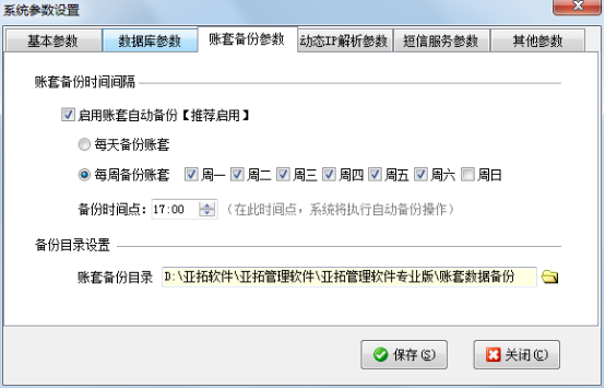 另外在“系统参数”——“账套备份参数”中可以设置是否启用自动备份、备份时间间隔和备份目录。我们强烈建议启用自动备份,以便账套出现问题的时候从账套备份文件中恢复数据。