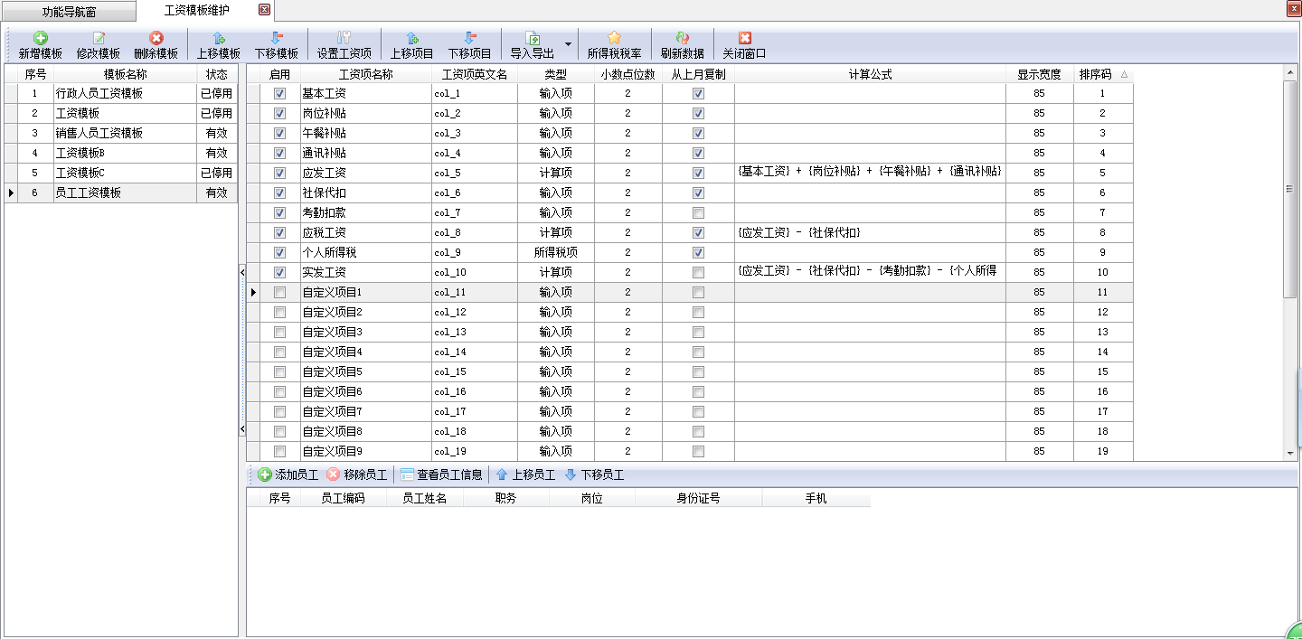 在功能导航窗点击“综合管理”——“工资模板维护”即可打开“工资模板维护”界面,如下图所示。