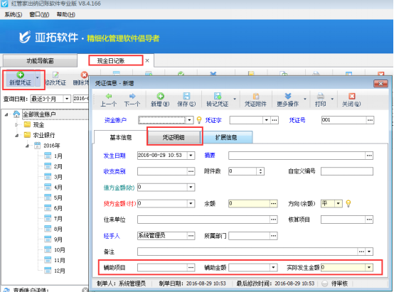 红管家出纳记账软件、亚拓管理软件(标准版、专业版)中的出纳管理模块,在新增凭证中有的需要填写辅助项目和凭证明细,软件支持设置在新增凭证时显示这些项目。下边以出纳软件为例,展示一下如何设置凭证显示凭证明细和辅助项目项。