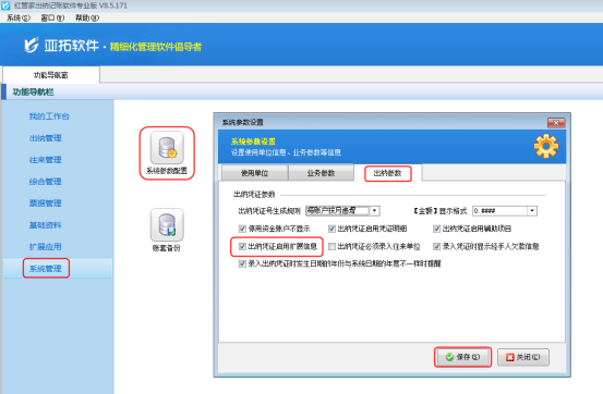 打开“系统管理”—》“系统参数配置”,在“出纳参数”界面勾选“出纳凭证启用扩展信息”然后保存,如图1所示。