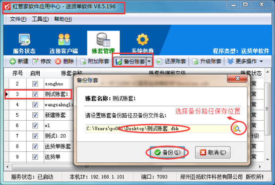 送货单单机版更换电脑需要首先把原来的电脑做好备份工作,备份是在电脑的应用中心(红色图标)上进行操作。备份时可以选择备份的保存路径,为了更清晰的看到备份数据方便拷贝,可以把备份路径更改为桌面。具体操作如下图1所示: