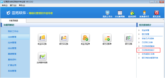 然后在“出纳管理”模块最右侧的“相关查询统计”内点击“日记账综合统计”,如图2所示,系统打开“日记账综合统计”界面,如图3所示。