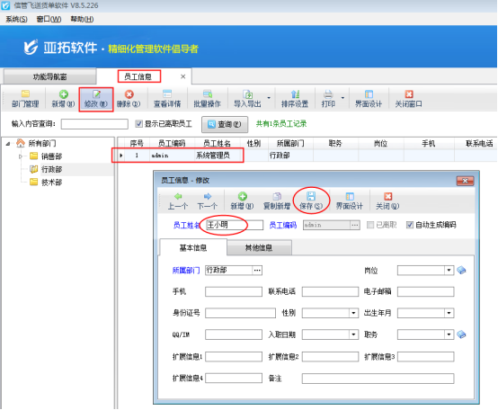 在功能导航窗点击“基础资料”——》“员工信息”,打开员工信息界面,选择“系统管理员”,点击“修改”按钮,如图3所示,将“系统管理员”修改为“王小明”,修改之后点击“保存”按钮。然后重新登录软件时,即可看到“系统管理员”已更改为“王小明”,如图4所示。