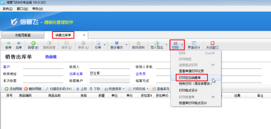 信管飞RMS、信管飞送货单软件、信管飞仓库管理软件开单后可以直接打印单据,另外软件还支持打印空白销售单,以满足部分客户打印空白销售单的需求。下面我们以信管飞RMS专业版为例介绍一下打印空白销售单的具体的操作步骤。