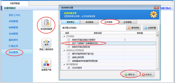 在功能导航窗点击“系统管理”—》“系统参数配置”—》“业务参数”,即可进入到“业务参数”配置界面,在打印参数内找到“处于‘待审核’的单据可打印”参数,把这个参数的勾选去掉,然后保存,如下图一所示。