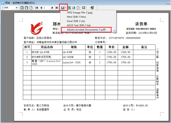 信管飞送货单软件、信管飞RMS、信管飞仓库管理软件等都支持打印送货单(销售单),软件支持把送货单预览界面导出到Excel文件、Html文件、Text文件及jpg、pdf等电子档格式,方便用户导出送货单的电子档给客户看,方便客户可以随时查看送货单内容。下面我们以信管飞送货单软件为例讲一下如何把送货单预览界面导出为pdf格式。