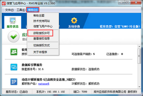 以信管飞RMS专业版为例,软件安装后桌面上有两个图标,红色是软件应用中心,蓝色是客户端程序,电脑机器特征码需要在应用中心内查看,打开软件应用中心,点击菜单“帮助”->“获取授权许可”,在“获取授权许可”界面可查看电脑特征码,然后将机器特征码发给客服人员,由客服帮您申请授权即可,如下图所示。