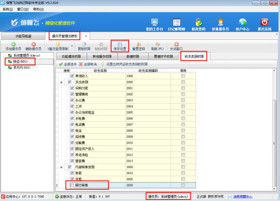 信管飞出纳记账软件登记现金和银行日记账时,可以选择收支类别,如果不想让操作员看到所有的出纳凭证,可以设置操作员仅能查看部分收支类别。本文介绍下如何设置操作员的收支类别权限?