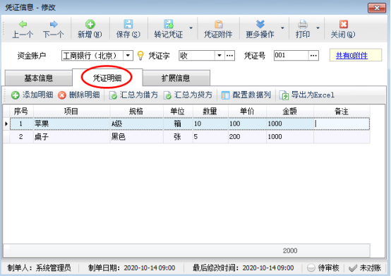 在功能导航窗点“出纳管理”—》“银行日记账”,新增凭证界面点击“凭证明细”,可以添加凭证明细内容,如图1所示: