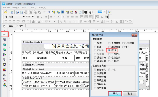 如何设置打印多页时,每一页都显示多联备注内容,下边进行示范,首先进入模板设计器界面(开单界面打印按钮下点击打印格式设计,在打印格式设计界面选择模板点击设计格式进入设计器界面),点击左侧工具栏的“插入边条”,选择“浮动”位置放到多联备注处,包围备注内容,如下图所示: