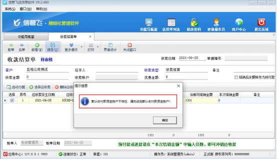 二、保存时提示“默认收付款资金账户不存在,请先设定默认收付款资金账户”,如下图所示: