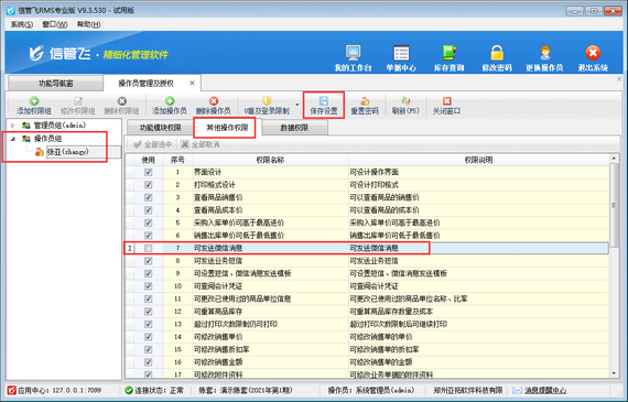 在功能导航窗点击“系统管理”—》“操作员及授权”,可进入“操作员管理及授权”界面,选中操作员账号,在“其他操作权限”界面将“可发送微信消息”权限打钩取消,然后保存权限设置,如下图所示,设置操作员“张亚”没有“可发送微信消息”权限。