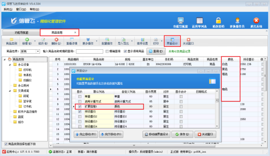 在功能导航窗点击“业务处理”—》“送货汇总表(按商品)”打开送货汇总表(按商品)界面,然后在工具栏点击“界面设计”,找到“商品扩展信息1”数据项,自定义列名修改为“颜色”并勾选显示出来即可,如下图所示。