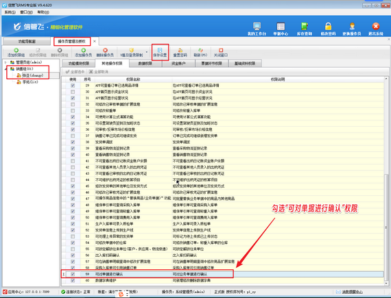 解决方法如下:使用系统管理员账号登录软件,在功能导航窗点击“系统管理”—》“操作员及授权”打开操作员管理及授权界面,选择操作员账号,在“其他操作权限”界面将“可对单据确认”权限勾选上,然后保存权限设置,如下图所示。