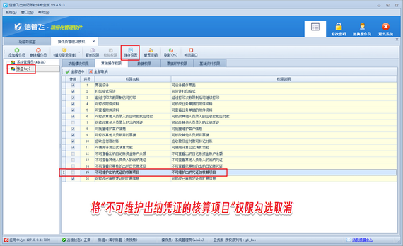解决方法如下:使用系统管理员账号登录软件,在功能导航窗点击“系统管理”—》“操作员及授权”打开操作员管理及授权界面,选择操作员账号,在“其他操作权限”界面将“不可维护出纳凭证的核算项目”权限勾选取消,然后保存权限设置,如下图所示。