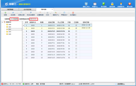 解决方法如下:功能导航栏点击“账务处理”—》“期末结账”,工具栏点“反结账”,反结账完成后,相应账户回退到上一个账期,例如提示“单据日期不能小于当前账期2023-04-01”,就把账期反结账到2023年第3期,如图: