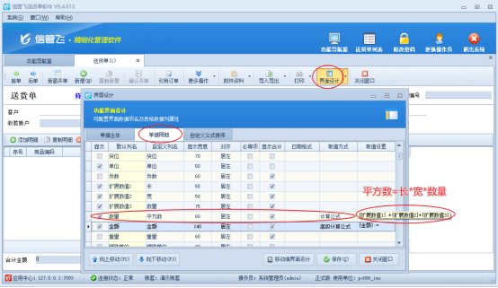 在界面设计窗口中,用户需找到并自定义扩展数值1、2、3为长、宽、数量,并设置“平方数”的计算公式为三者的乘积。由于系统默认金额计算公式为单价乘以数量,当“数量”被配置为“平方数”时,金额将自动按平方数与单价计算,无需额外配置。