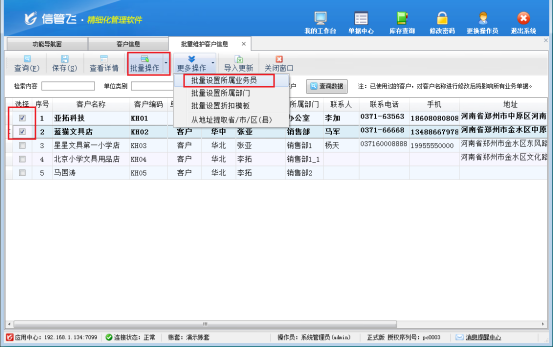软件界面设计简洁直观,操作流程清晰易懂。用户只需在功能导航窗点击“基础资料”—“客户信息”,进入客户信息界面后,通过工具栏的“更多操作”选择“批量维护客户信息”,即可进入批量维护界面。在这里,企业能够快速进入批量操作模式,轻松勾选需要设置所属业务员的客户信息,简单几步即可完成批量设置,让客户信息管理变得轻松简单。