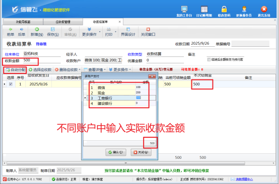 多账户输入与自动分配:在收款结算单界面,打开收款账户选项。在多资金账户中分别输入实际收款金额。只需确保多个账户的收款金额相加等于本笔应收款金额,软件便会自动进行分配,无需您手动计算与调整,大大提高了结算的准确性与效率。