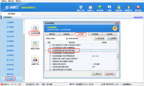 登录软件后,只需在功能导航窗中点击“系统管理”,进入“系统参数配置”模块,选择“业务参数”选项卡,在“数据选择参数”栏目中,勾选“在选择商品窗口显示客户相关商品”参数,并点击“保存”按钮,配置即刻生效,无需重启软件即可立即体验。