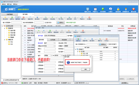 有用户在使用信管飞 RMS过程中,遇到这样的问题:修改客户信息选择部门时,系统提示 “当前部门存在下级部门,不能选择”,导致操作无法继续。这一提示并非故障,而是系统参数控制带来的使用限制。