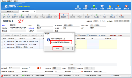 第二步,单据审核,发起确认。功能启用后,在销售管理等模块新开单据(以销售出库单为例),完成单据填写、保存并审核后,点击单据界面的“更多操作”,选择“确认单据”选项,系统会自动弹出提醒“单据确认后不能再进行反审修改!”,双重提醒规避误操作,确保用户在确认前充分知晓操作后果。