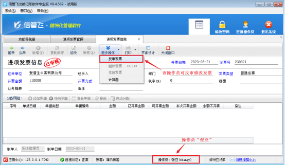 此文章相关演示视频:如何设置操作员可反审修改发票演示视频 信管飞出纳记账软件中支持反审发票,发票已审核后如发现填写错误,可以反审修改发票,反审后,发票状态恢复为未审核状态,可以继续对该发票进行修改操作,如下图所示。 如果需要操作员反审修改发票,