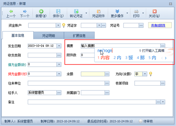 登记出纳凭证时默认可以直接输入摘要内容,有用户在登记出纳凭证时,可以选择摘要,但是无法输入摘要内容,如下图所示,本篇文章介绍一下解决方法。 演示视频观看链接:出纳凭证摘要只能选择不能随意输入,如何解决演示视频 出现此问题的原因是:启用了“出纳凭证摘要只能选择不能随意输入”参数导致的。解决方