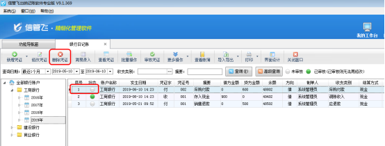 信管飞出纳记账软件标准版和专业版在新增保存日记账凭证后都可以直接审核凭证,凭证审核后,不允许直接删除。客户如果需要删除已审核的凭证,需要先反审凭证,再进行删除。下面我们介绍一下在信管飞出纳记账软件专业版中如何删除已审核的日记账凭证? 在功能导航窗点“出纳管理”—》“银行日记账”即可进入“银行日记账”界面,对“已审核”的凭证进