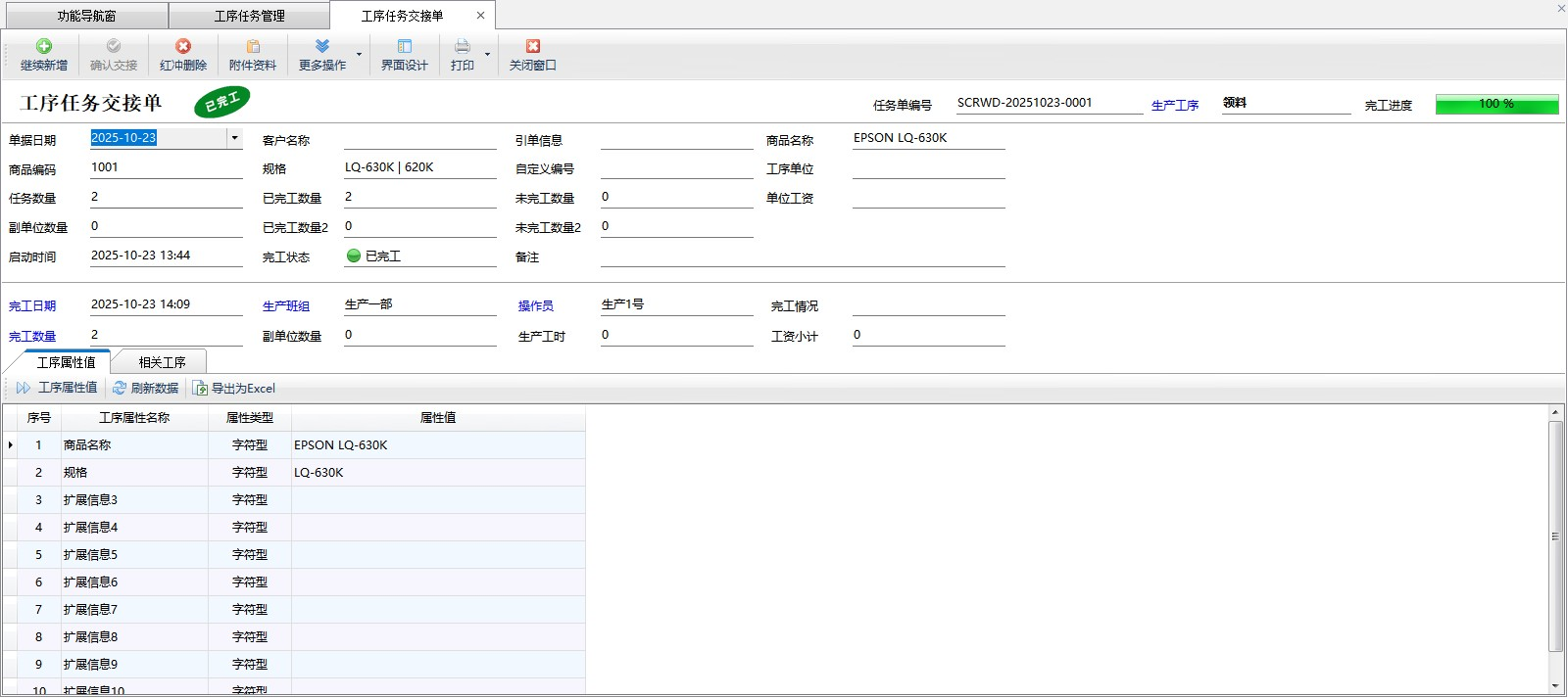 工序完工:点击“工序完工”可以打开工序任务交接单界面,完工日期、生产班组、操作员、完工数量等是必填项,确认交接更新完工数量。