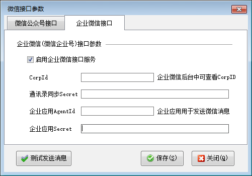 在功能导航窗点击“扩展应用”—》“微信接口参数”可以打开微信接口参数设置窗口,可以设置微信消息服务接口参数以及企业微信接口参数。